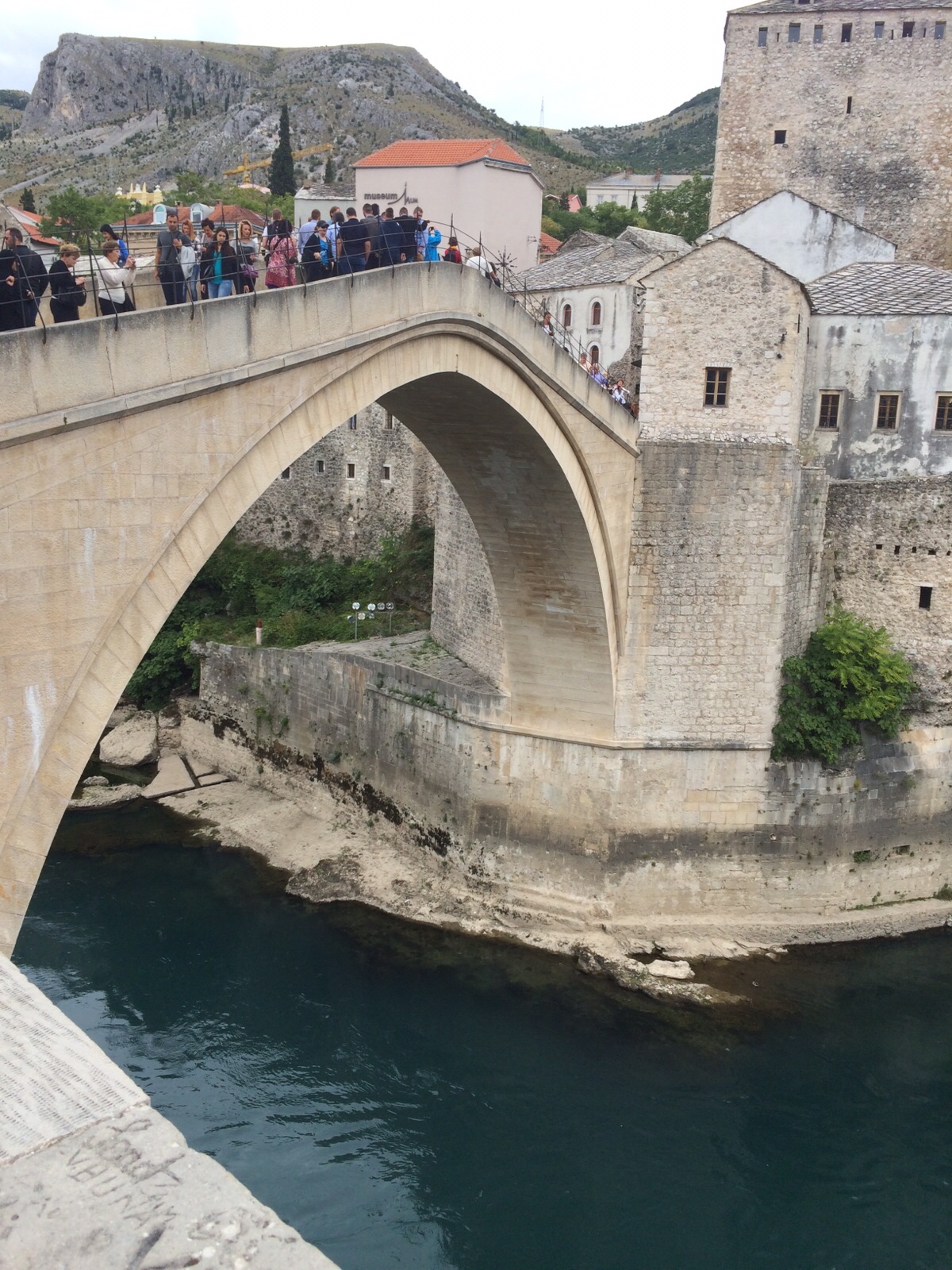 We walked down the cobbled streets to watch the adrenalin junkies jump off the 24m high arched bridge and plunge into the river below. The river did not look deep enough and they tucked their legs in as they jumped. Jumping off Stari most started 427 years ago when it was first built. There is a diving competition held every summer.